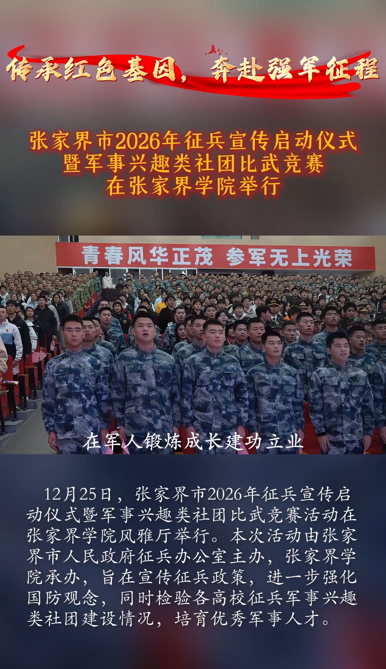 传承红色基因,奔赴强军征程!张家界市2026年征兵宣传启动仪式暨军事兴趣类社团比武竞赛在张家界学院举行。